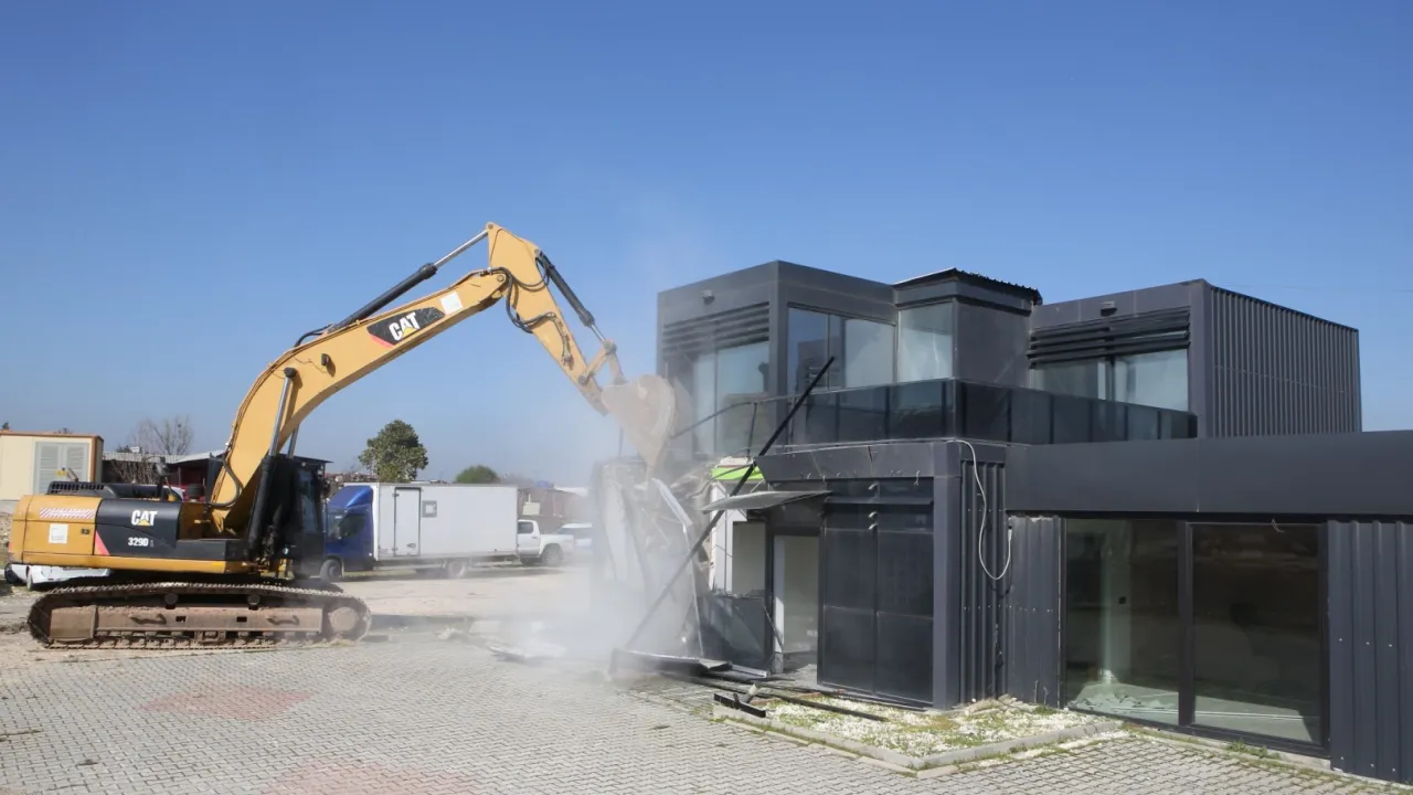 Yıkım çalışması kapsamında ilk olarak, Demirci Mahallesi'nde tespit edilen 192 metrekarelik iki katlı ofis binasına müdahale edildi.