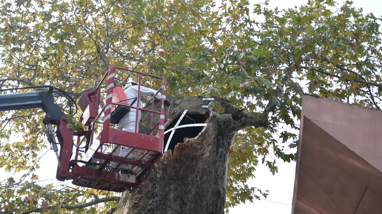 Park ve Bahçeler Dairesi Başkanlığı ekipleri tarafından yapılan incelemede, anıt ağacın açık yarasında çürümüş ve mantarlaşmış bölümler tespit edildi. Hızlı bir şekilde bakım ve restorasyon işlemlerine başlayan ekipler, özel ilaçlarla 'çürümeye yol açan' bakterileri temizledi. Ağacın iskeletine teller aracılığıyla destek uygulanırken, son aşamada özel yalıtım malzemesi kullanılarak ağacın açık yarası kapatıldı. Tedavi gören kısım boyanarak çınar ağacının formu yeniden düzenlendi.