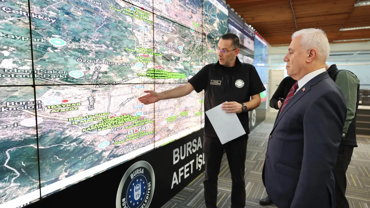 BURSA (İGFA) - Bursa'da etkili olan şiddetli rüzgâr ve etkili yağışa karşı aralıksız çalışan Büyükşehir Belediyesi ekipleri, vatandaşların mağduriyet yaşamaması için olaylara hızlı bir şekilde müdahalede bulunuyor. Sahada görev yapan ekipleri ziyaret ederek çalışmalar hakkında bilgi alan Bursa Büyükşehir Belediye Başkanı Mustafa Bozbey, daha sonra Merinos Yerleşkesi'ndeki Afet Koordinasyon Merkezi'ne (AKOM) geçerek yetkililerle birlikte son durumu değerlendirdi.