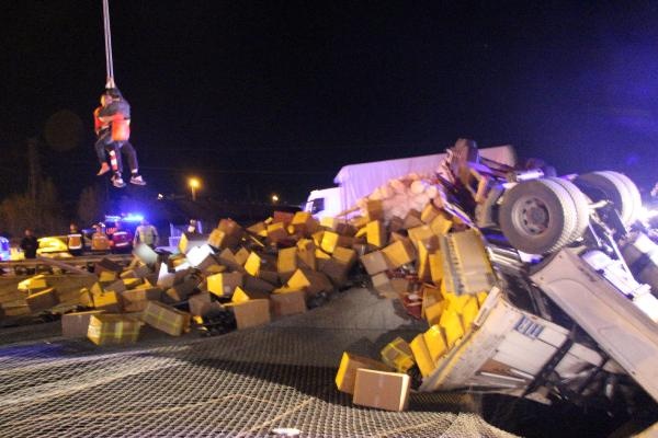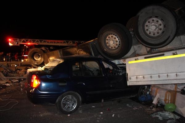 BOLU'da TEM yolunda kontroden çıkan ve çekici kısmı bariyerleri aşarak köprüde asılı kalan TIR'ın dorsesine arkadan otomobil çarptı. Kazada 1 kişi öldü, 4 kişi yaralandı. 40 metre yükseklikteki köprüde asılı kalan çekicideki sürücü, halatla yukarıya çekilerek kurtarıldı.
