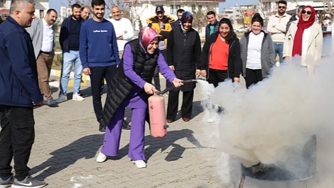 Personeller, yangın tüpü ile güvenli alanda yakılan yangına müdahalede bulunarak eğitimde aldığı bilgileri uygulama imkânı buldu.