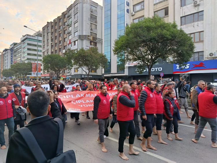 İzmir Büyükşehir Belediyesi'ne bağlı İZENERJİ, İZELMAN, İZFAŞ, EGEŞEHİR ve İZTEK çalışanları, aylardır ödenmeyen yan haklar ve 'çıplak ücret' uygulamasına karşı bugün tarihi bir eyleme imza attı. DİSK/Genel-İş 1, 2, 3 ve 9 No'lu Şubelerin çağrısıyla 23 bin işçi, yalın ayak yürüyüş gerçekleştirerek tepkisini ortaya koydu.