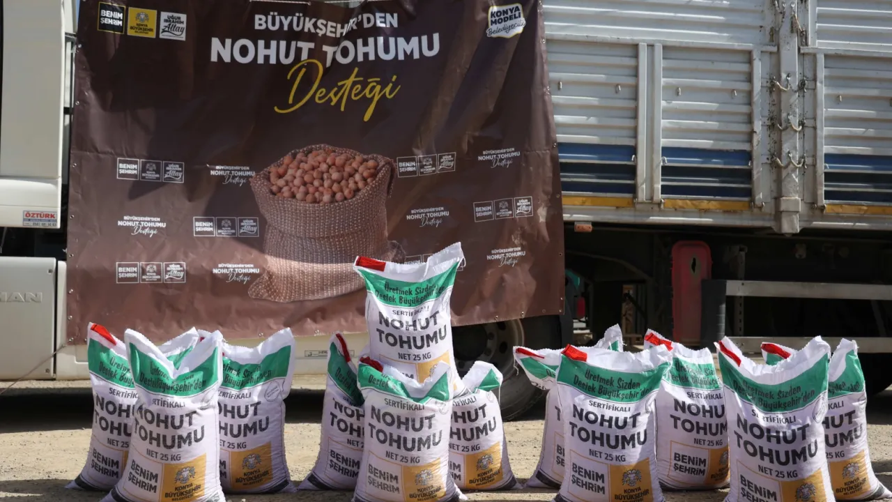 Konya Büyükşehir Belediye Başkanı Uğur İbrahim Altay, değişen iklim şartlarına karşı 31 ilçede tarımsal destekleri şekillendirdiklerini belirterek, 'Kuraklıkla mücadelede ürün deseninin değişmesi büyük önem taşıyor. Nohut gibi az su isteyen ve iklim şartlarına daha dayanıklı ürünlerin yaygınlaştırılması çiftçimizin maliyetini düşürdüğü gibi su kaynaklarının korunmasına da katkı sağlıyor. Biz de 31 ilçemizde önceden başvurularını aldığımız çiftçilerimize 7 bin 725 dekar alanda ekilmek üzere yüzde 50 hibeli, 115 bin 875 kilogram nohut tohumu desteğinde bulunduk. Yapılan bu destekleme ile yaklaşık bin 100 futbol sahası büyüklüğündeki bir alanı susuz tarımla üretime kazandırmış olacağız. Bereketli olmasını diliyorum' diye konuştu.