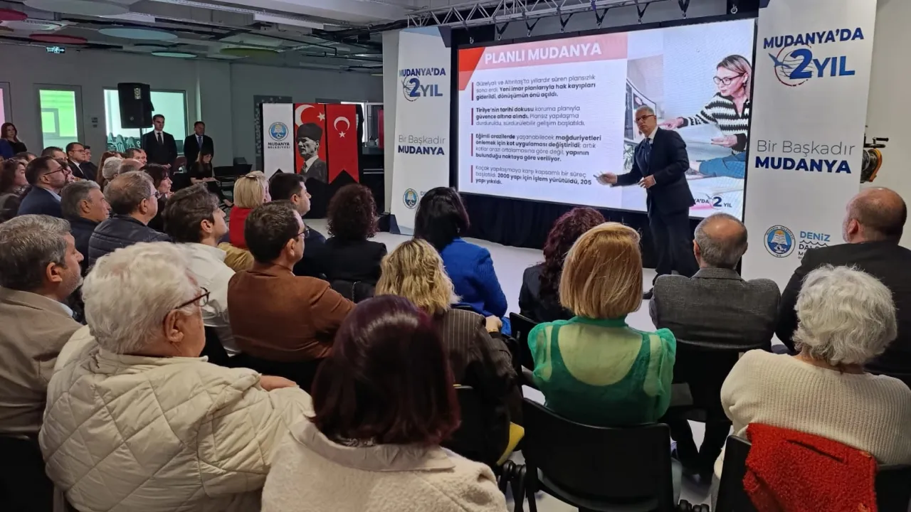 Göreve gelişinin ikinci yılında düzenlenen kapsamlı toplantıda, 'Başka Bir Mudanya' vizyonu doğrultusunda hayata geçirilen projeleri tüm ayrıntılarıyla kamuoyuyla paylaştı. Tamamlanan ve devam eden çalışmalarla yeni hedefler projelerin geniş perspektifle ela alındığı toplantıda, iki yılda ilçenin sessiz sedasız değişmediğini değişimin görüldüğü ve hissedildiği gibi konuşulduğunu da dile getirdi.