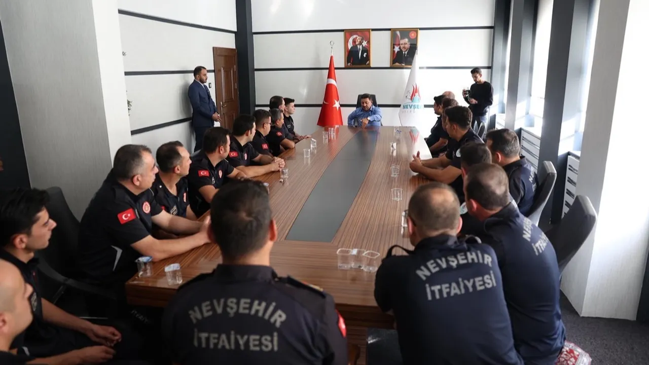 Nevşehir Belediye Başkanı Rasim Arı, itfaiye personelini kabul ettiNEVŞEHİR (İGFA) - Nevşehir Belediye Başkanı Rasim Arı, 25 Eylül - 1 Ekim Dünya İtfaiyecilik Haftası münasebetiyle Nevşehir İtfaiye Müdürü Fatih Kürk ve beraberindeki itfaiye personelini makamında kabul etti.