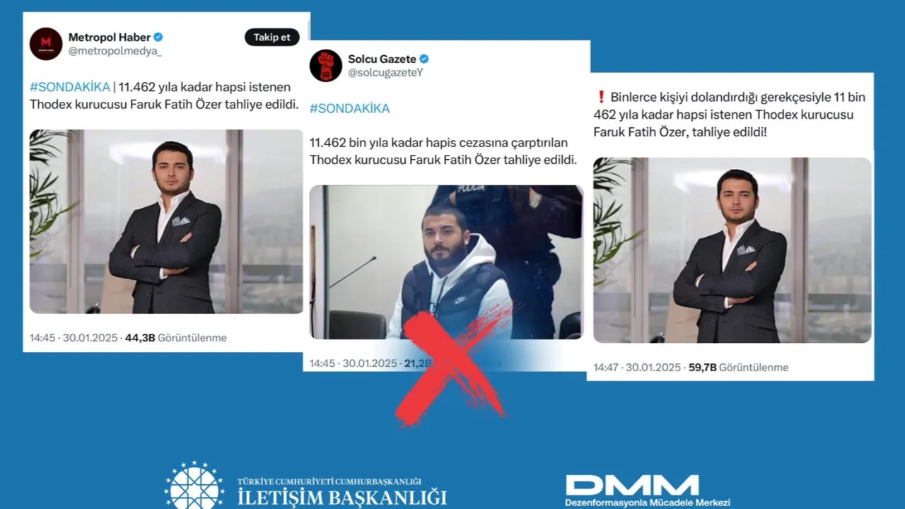 İletişim Başkanlığı Dezenformasyonla Mücadele Merkezi, toplamda 11 bin 196 yıl 10 ay 15 gün hapis cezasına çarptırılan kripto para borsası Thodex'in kurucusu Faruk Fatih Özer'in tahliye edildiği iddialarını yalanladı.ANKARA (İGFA) - Bazı basın yayın organlarında yer alan ve sosyal medya hesaplarında paylaşılan, “Binlerce kişiyi dolandırdığı gerekçesiyle 11 bin 462 yıla kadar hapsi istenen Fatih Özer tahliye edildi.” iddiası manipülasyon içerdiği açıklandı.