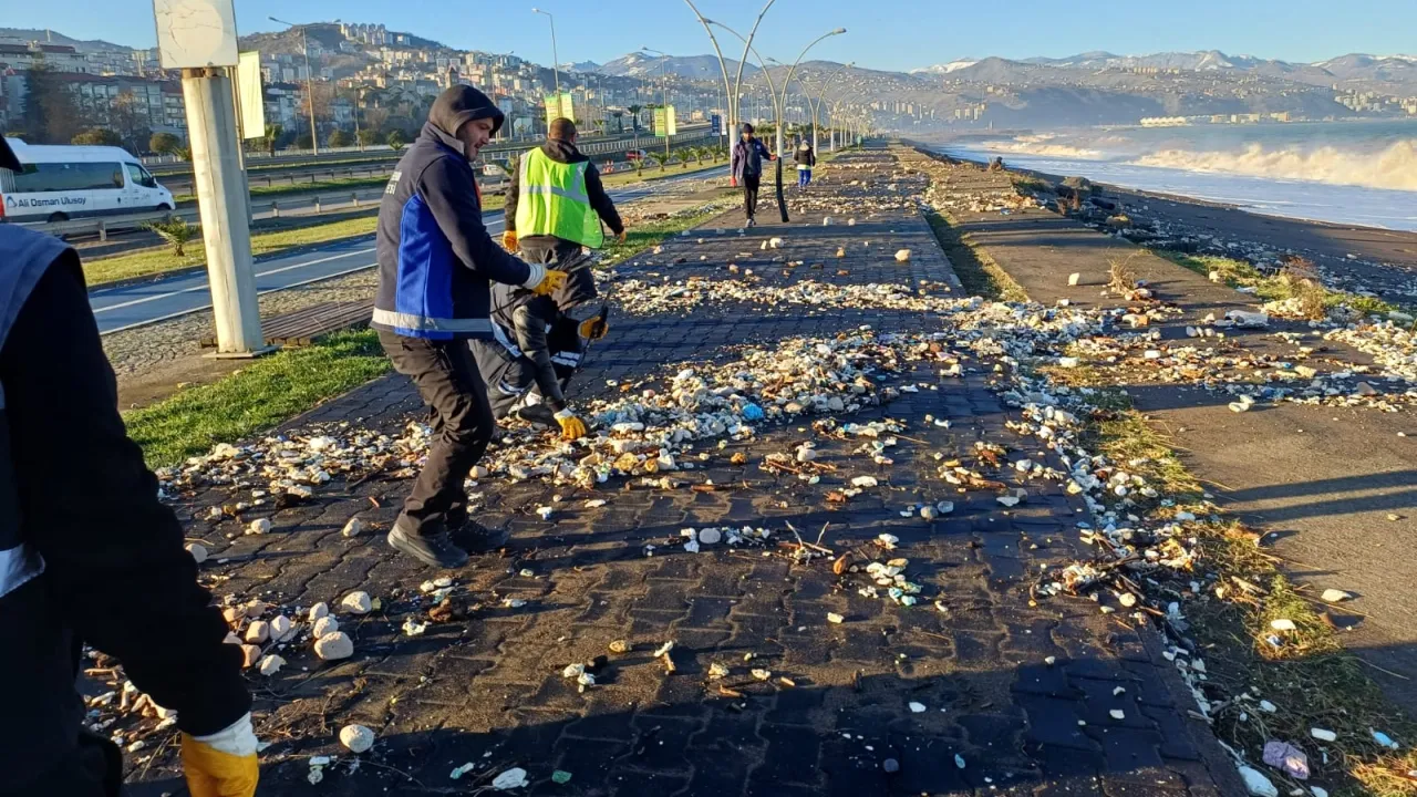 Yoğun dalgaların etkisiyle denizin taşması sonucu Ayasofya sahil yolunda çeşitli atıklar ve birikintiler meydana geldi. Trabzon Büyükşehir Belediyesi Çevre Koruma ve Kontrol Dairesi Başkanlığı ekipleri, sabahın erken saatlerinde yıkama, süpürge ve mıntıka ekipleriyle birlikte kapsamlı bir temizlik çalışması başlattı.